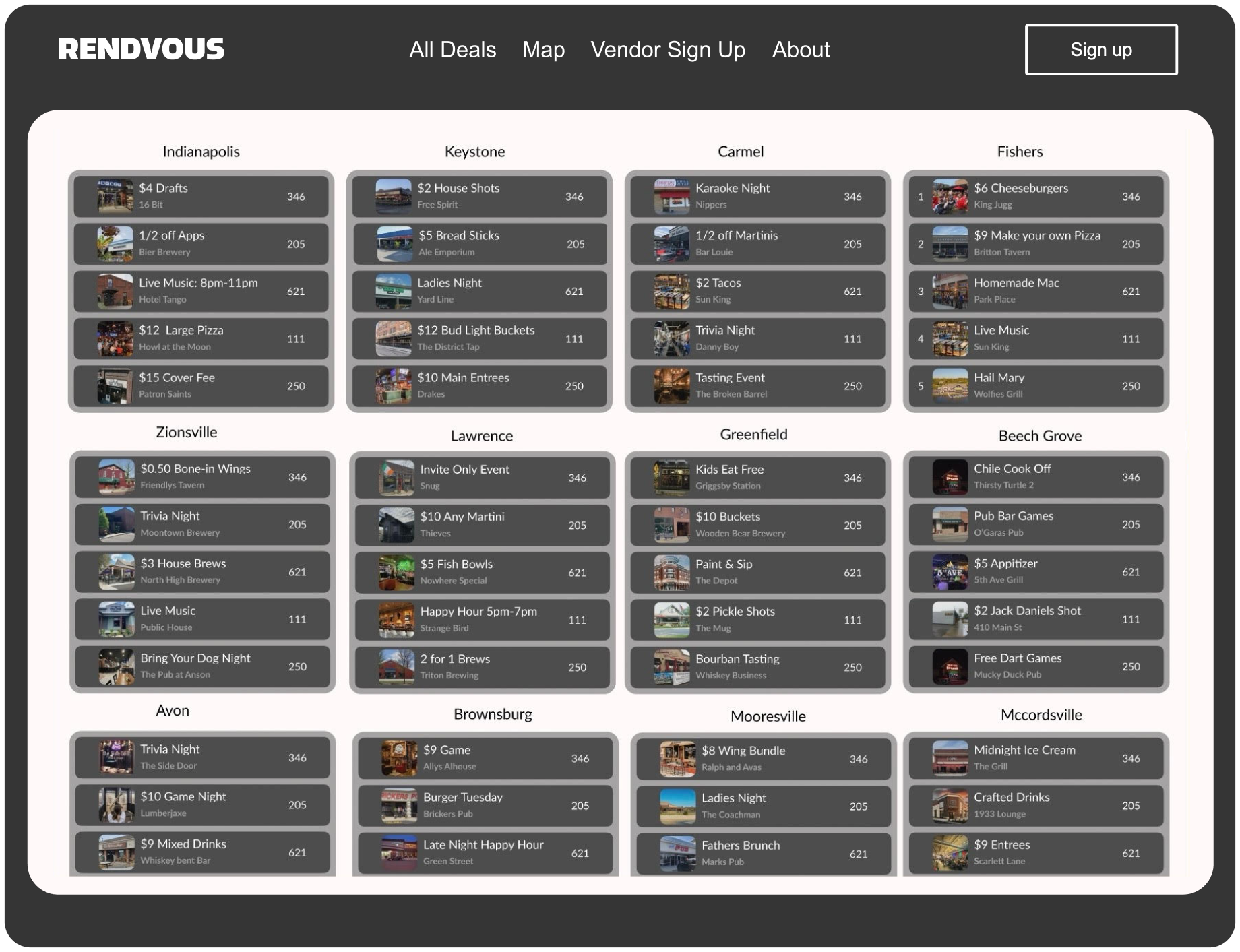 Zero. Yep, joining Rendvous is totally free for vendors. No listing fees, no upfront costs, just an easy way for restaurants and bars to promote their deals and specials. It's all about boosting visibility without any financial barriers.